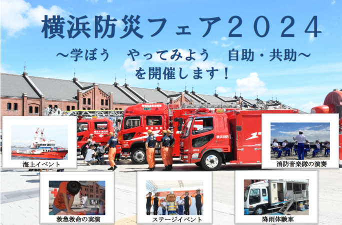 今年も「横浜防災フェア2024」を横浜赤レンガ倉庫イベント広場にて開催します。普段見ることのできない防災関係車両や、ブースの出展、海上での水難救助訓練の実施や船舶の紹介、横浜市消防音楽隊の演奏、ステージイベントの開催など、内容盛りだくさん!是非お越しください。